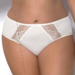 Figi damskie typu brazyliany wykonane z koronki. Ozdobione elastyczną koronką. Nogawki wykończone ozdobną gumokoronką.