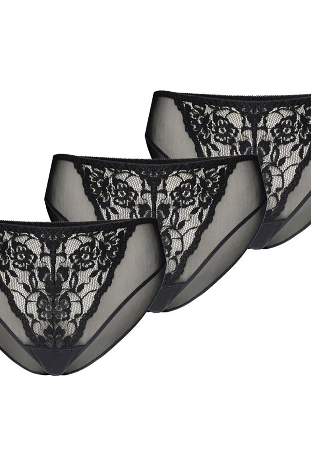 Wielopak damskich klasycznych majtek w kolorze intensywnej czerni. Trójpak majtek posiada prosty klasyczny fason i adresowany jest do kobiet o każdej sylwetce bez względu na jej kształt i wiek. Zestawy cieszą się sporą popularnością wśród kobiet ceniących sobie komfort i wygodę. Z przodu dla uzyskania lepszego efektu wizualnego i podniesienia jakości majtki wykonane są z efektownej, delikatnej miłej w dotyku i dla kobiecego ciała koronki o wyrazistym motywie kwiatowym. Majtki z tyłu na pupie są prześwitujące, kryją i jednocześnie seksownie odsłaniają pośladki kusząc męskie oko. Delikatna siatka dopasowuje się do pośladków, nie dzieli ich, nie uciska i nie zostawia śladów na ciele. Koronka podobnie jak siatka są wysokiej jakości. Majtki są bardzo wygodne i komfortowe w codziennym użytkowaniu i w zestawieniu z koronkowym miękkim biustonoszem tworzą efektowny klasyczny czarny ponadczasowy zestaw, w którym każda kobieta wygląda zachwycająco. W pasie od wewnątrz figi obszyte są cienką elastyczną gumką, ta sama cienka gumka wykańcza bardzo estetycznie majtki wokół ud, nie odznacza się spod dopasowanej odzieży. W okolicach kroku od wewnątrz majtki podszyte są bawełną, która gwarantuje świeżość i przewiewność.