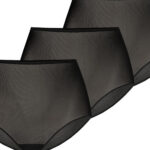 Zestaw bawełnianych damskich majtek z dodatkiem elastycznego włókna lycry w kolorze czarnym. Majtki posiadają wysoki stan sięgający do pępka, z boku są również wysoko zabudowane. Wysoki stan majtek występujący w trójpaku jest chętnie nabywany przez kobiety, ponieważ maskuje mankamenty sylwetki, tak nielubiany wystający brzuszek i boczki. Majtki modelują sylwetkę i podkreślają również jej zalety. Z przodu majtki zdobi delikatna prześwitująca siatka o bardzo drobnym splocie, wszyta poziomo miedzy warstwy materiału. Całość prezentuje się bardzo efektownie i podnosi walory estetyczne. Figi damskie, z tyłu są mocniej zabudowane, po całości kryją pośladki i podkreślają kształt pupy. Obszyte są na pośladkach i wokół ud delikatną elastyczną cienką gumką, która nie dzieli pośladków, nie zostawia otarć na skórze. Wysoki stan majtek doskonale sprawdzi się pod dopasowaną sukienką czy spódnicą. Majtki w trójpaku poza efektownym i estetycznym wykonaniem są bardzo wygodne w codziennym użytkowaniu. Każda kobieta ceniąca sobie komfort i wygląd powinna posiadać je w swojej garderobie.