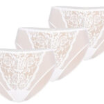 Zestaw damskich majtek z wysokim stanem w kolorze naturalnego beżu, maskujące kobiece niedoskonałości. Wielopak fig damskich wykonany jest z przewiewnej, milej dla skóry bawełny z domieszką lycry. Beżowy kolor majtek w trójpaku sprawdza się pod białymi i jasnymi ubraniami, jest nie widoczny, ponieważ zlewa się z odcieniem skóry.