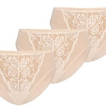 Zestaw majtek Violetta w trzech kolorach czarnym, białym i beżowym. Wielopaki są bardzo popularne wśród kupujących i cieszą się dużą popularnością. Ceny trójpaków są atrakcyjne. Rozmiary majtek są w wielopakach od XS DO XXL. Trzypaki dają nam możliwość nabycia za jednym razem w dobrej cenie trzech podstawowych kolorów majtek, które można odpowiednio dopasować do koloru zakładanej odzieży. Majtki Violetta posiadają wysoki stan, dzięki temu maskują miejsca, które kobieta nie lubi pokazywać, między innymi wystający brzuszek i nadprogramowe boczki. Wykonane są z delikatnej, miłej w dotyku przewiewnej i ekologicznej bawełny, która zapewnia komfort i wygodę w użytkowaniu. W kroku od wewnątrz podszyte są dwiema warstwami bawełny, która absorbuje wilgoć i pozwala na utrzymanie i zachowanie świeżości przez cały dzień. Majtki Violetta z przodu wykonane są z elastycznej, eleganckiej i szlachetnej koronki o gęstym motywie kwiatowym. Z tyłu majtki są mocno zabudowane, kryją całe pośladki. W pasie wszyta jest cienka elastyczna i delikatna gumka, która nie zostawia śladów na skórze, nie ociera. Majtki prane w odpowiedniej temperaturze zgodnie z metką nie zmienią swojego pierwotnego wyglądu i zachowają swoją żywotność na długi czas.