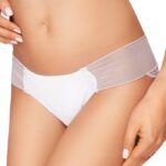 Figi damskie wykonane z gładkiej mikrofibry i koronki. Tył z siateczki obszytej koronką, ozdobiony kokardkami.