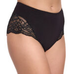 Bawełniane, pełne figi w kolorze czarnym o nieco podwyższonej talii. Po obu stronach delikatne wstawki z gustownej koronki. Doskonale przylegają do ciała, dając poczucie komfortu i wygody.