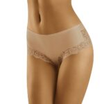 Zmysłowe figi, które swym krojem lekko nawiązują do szortów. Przód nieco pełniejszy, bardziej zabudowany, koronkowy, ażurowy, wygląda seksownie i kobieco. U góry wstawka z gładkiej tkaniny, w formie ozdobnego paska. Tył odwrotnie w przeważającej części wykonany z kryjącej, gładkiej tkaniny.