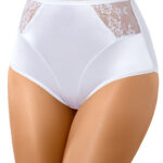 Figi damskie z podwyższonym stanem z miękką szeroką gumką w pasie, która świetnie trzyma majtki na brzuchu. Przód fig wykonany został z tiulu i eleganckiej koronki, tył natomiast jest gładki. Majtki uszyte zostały z wysokiej jakości bawełny w naszej szwalni w Toruniu.