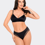 Eleganckie figi z wysokim stanem, które swoim stylem nawiązują do rustykalnych klimatów. W pasie majtki podszyte zostały delikatnym tiulem. Koronka o ażurowym wykończeniem dodaje im ponadczasowej elegancji. Na uwagę z pewnością zasługują ozdobne przeszycia w pasie wykonane mieniącą się złotem nitką. Bogata koronka jest mięciutka w dotyku, a całe majtki są bardzo wygodne.