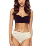 Wyjątkowo eleganckie i komfortowe figi damskie idealne dla każdej sylwetki. W pasie od wewnątrz doszyta delikatna gumka przytrzymująca. Całość wykonana z efektownej koronki z kwiatowym motywem. Przód od wewnętrznej strony podszyty, elastyczną, maskującą siateczką. Wyjątkowym elementem dekoracyjnym jest ozdobny, elastyczny sznurek ze złotymi dodatkami. Zawiązany wokół talii, idealnie podkreśli kobiece kształty. Sznureczek można indywidualnie dopasowywać, samodzielnie skracać i swobodnie odczepić. W celu zapewnienia wyższego poziomu komfortu noszenia, w kroczku umieszczona jest wkładka ze 100% bawełny. Majtki pakowane pojedynczo w eleganckie pudełko.