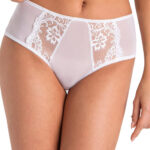 Klasyczne majtki damskie w kolorze czarnym. Majtki z boku są wyżej zabudowane i sięgają do połowy pępka. Ten fason majtek jest bardzo lubiany przez kobiety, ponieważ maskuje wystający brzuszek i odstające boczki, modeluje sylwetkę, podkreśla jej zalety. Figi wykonane są z wysokiej jakości bawełny miłej dla kobiecego ciała i elastycznego włókna lycry gwarantującego dłuższe użytkowanie. Z przodu majtki zdobione są siatką prześwitującą bardzo delikatną i drobną, która wszyta jest poziomo między warstwy bawełny. Całość komponuje się efektownie i bardzo elegancko. Z tyłu na pośladkach majtki są zabudowane, kryją pupę, wokół ud obszyte są bardzo estetycznie cienką elastyczną gumką, która idealnie dopasowuje się do ciała, nie zostawia śladów na skórze, nie przecina pośladków. Majtki sprawdzają się pod dopasowaną odzieżą. W połączeniu z biustonoszem pół usztywnianym lub usztywnianym tworzą efektowny zestaw bieliźniany do codziennego użytku, w którym to każda kobieta będzie czuła się pięknie i komfortowo.