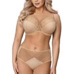 Eleganckie figi w kolorze mocca o wyższym, pełnym kroju, wykonane są z wzorzystej dzianiny, delikatnej koronki oraz siateczki.
