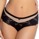 Figi damskie o pełnym, klasycznym kroju, przód z efektownej koronki, tył z siateczki.