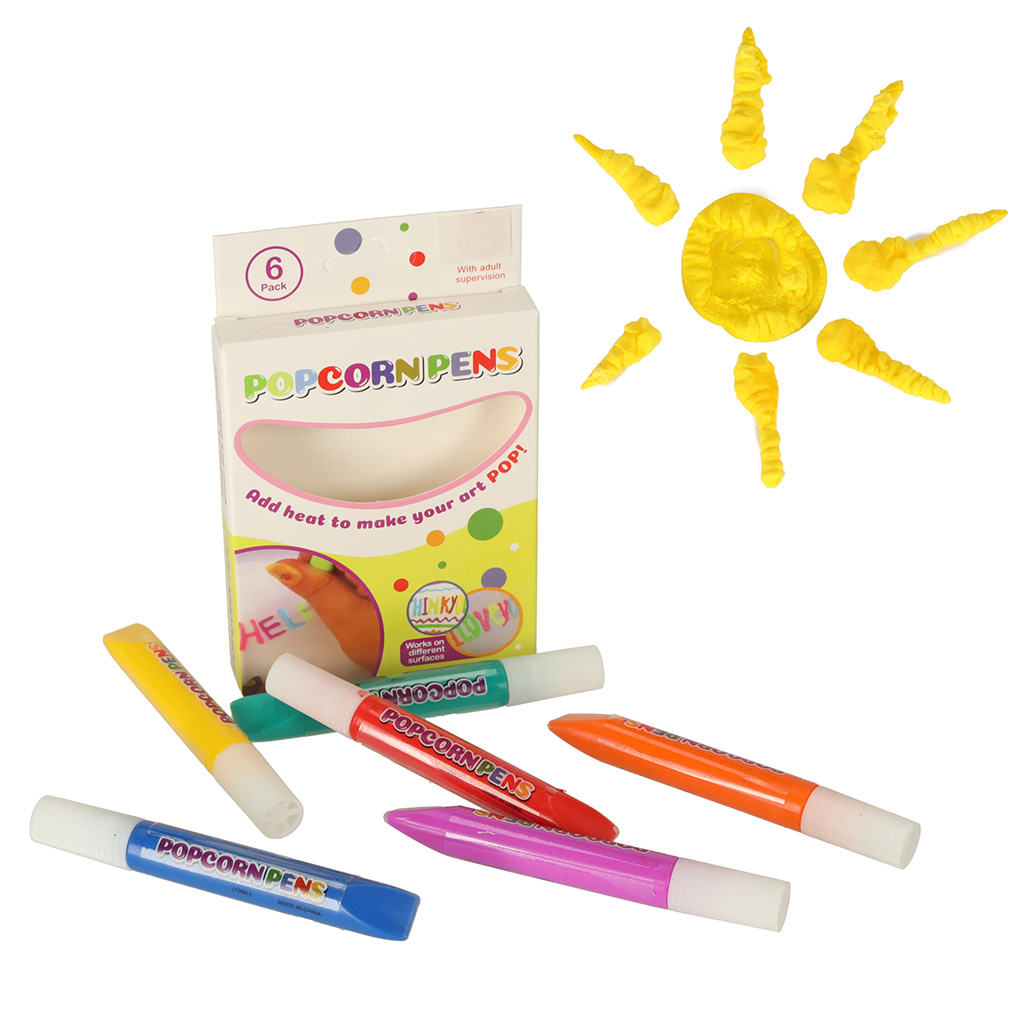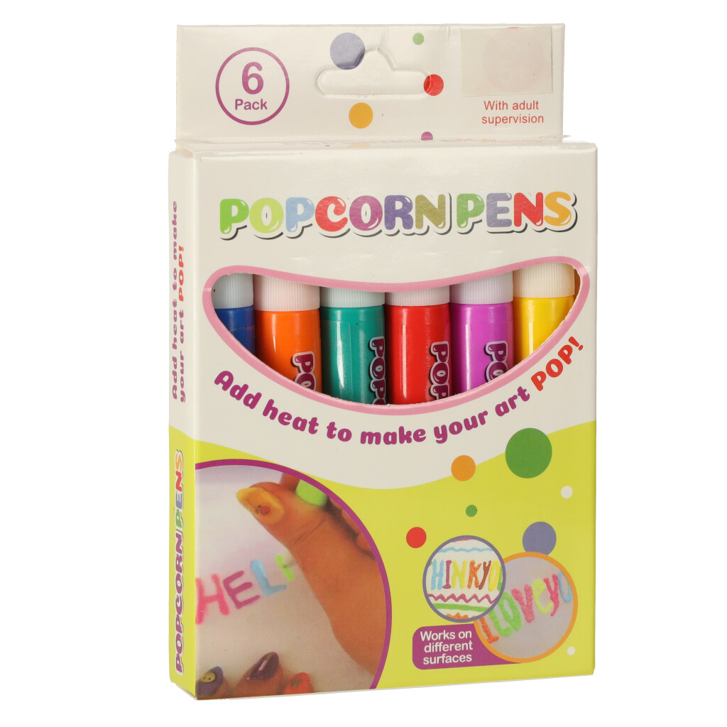 Popcornowe mazaki, które zamienią każdy najzwyklejszy projekt artystyczny w niezapomnianą przygodę i wyjątkowe dzieło sztuki. Wystarczy skierować ciepłe powietrze suszarki na narysowane linie, a tusz zacznie pęcznieć niczym popcorn! Ilość mazaków: 6.