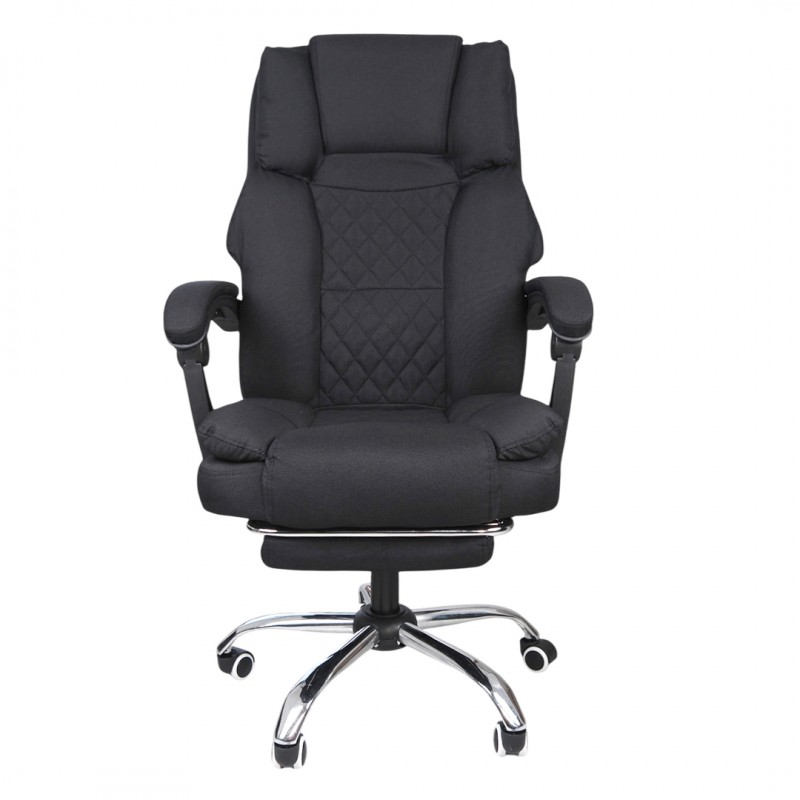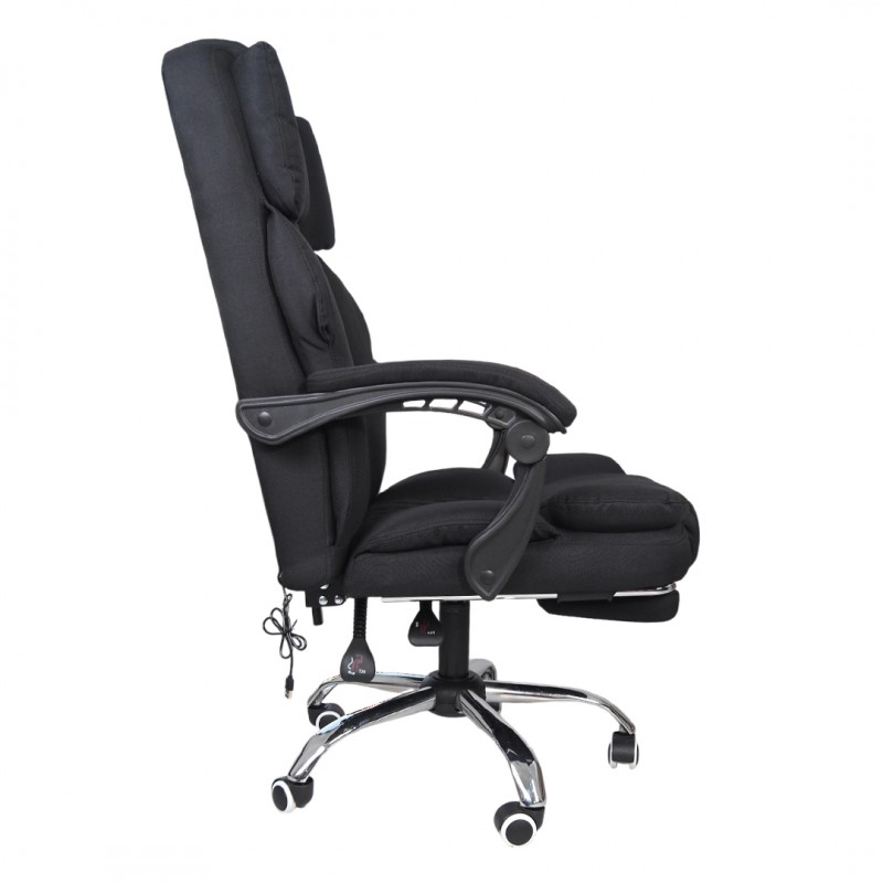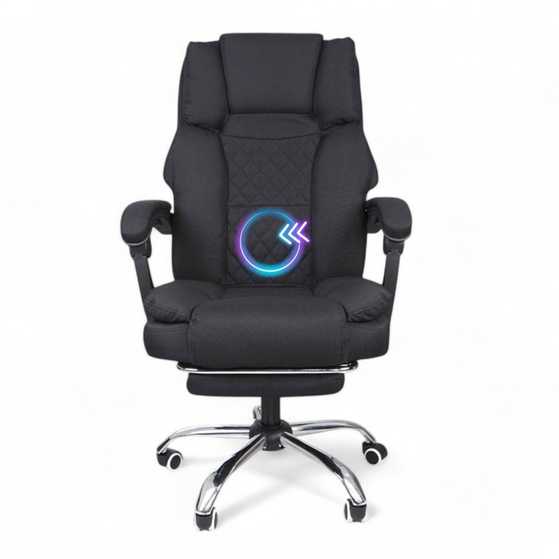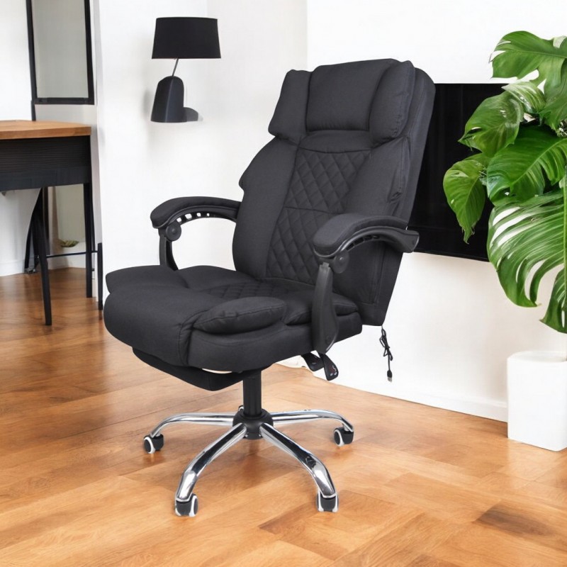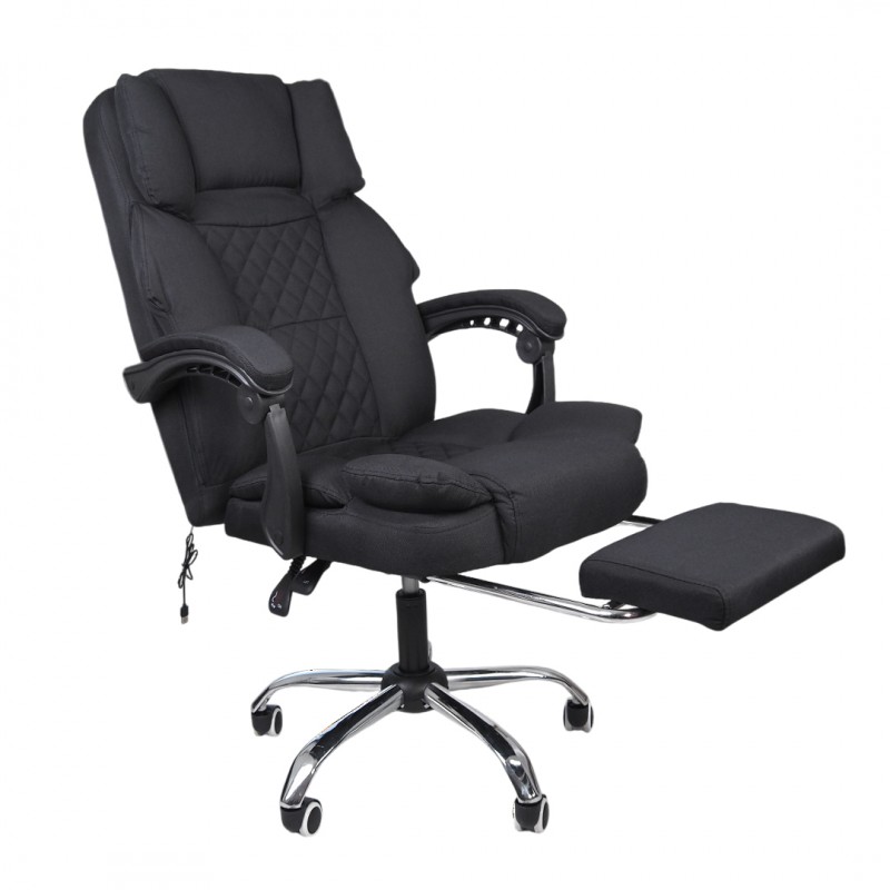 KOMFORTOWY FOTEL BIUROWY Z PODNÓŻKIEM I MASAŻEREM Z KOŃCÓWKĄ USBSpecyfikacja fotelaKolor: czarny materiałMateriał: tekstylny, pianka EPEWymiary: na zdjęciuMaksymalne obciążenie 150 kgWaga 15,5 kgWymiary opakowania: 74 x 32,5 x 59 cmCechy:- siedzisko, wypełnione miękką podwójną gąbką- regulacja kąta odchylenia oparcia wraz z blokada- stabilna i wytrzymała pięcioramienna podstawa- wysokiej jakości kółka plastikoweREGULACJA – fotel posiada regulacje wysokości siedziska. Dzięki temu możesz dostosować jego wysokość do swoich indywidualnych potrzeb co jest niewątpliwą zaletą. Możliwość regulacji odchylenia fotela, (90 -155 stopni) gwarantuje Ci chwilę relaksu i rozluźnienia.Pokrycie – szerokie siedzisko, oparcie, zagłówek oraz wierzchnia strona podłokietników powleczone materiałem tekstylnym oraz zastosowanie pianki EPE.