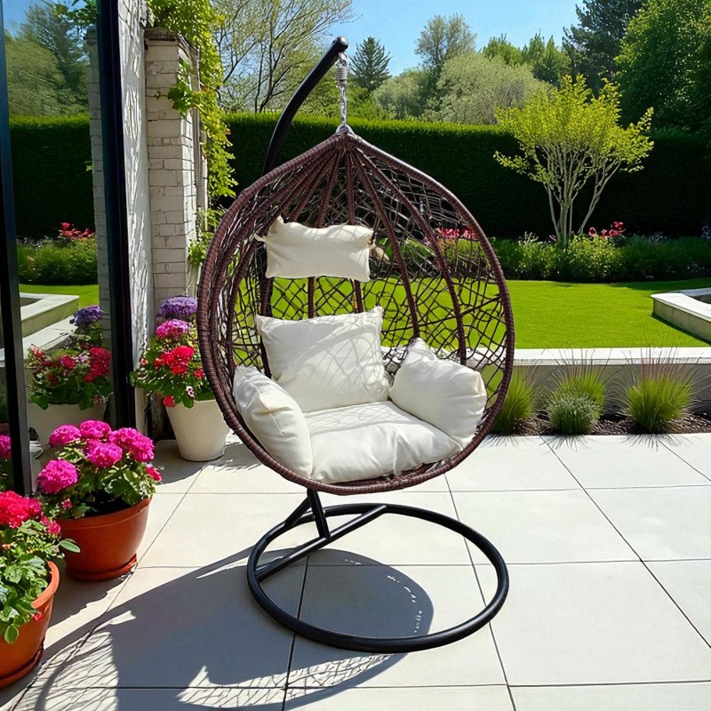 Fotel wiszący, huśtawka kokon brązowy z jasnymi poduszkami KR23BR