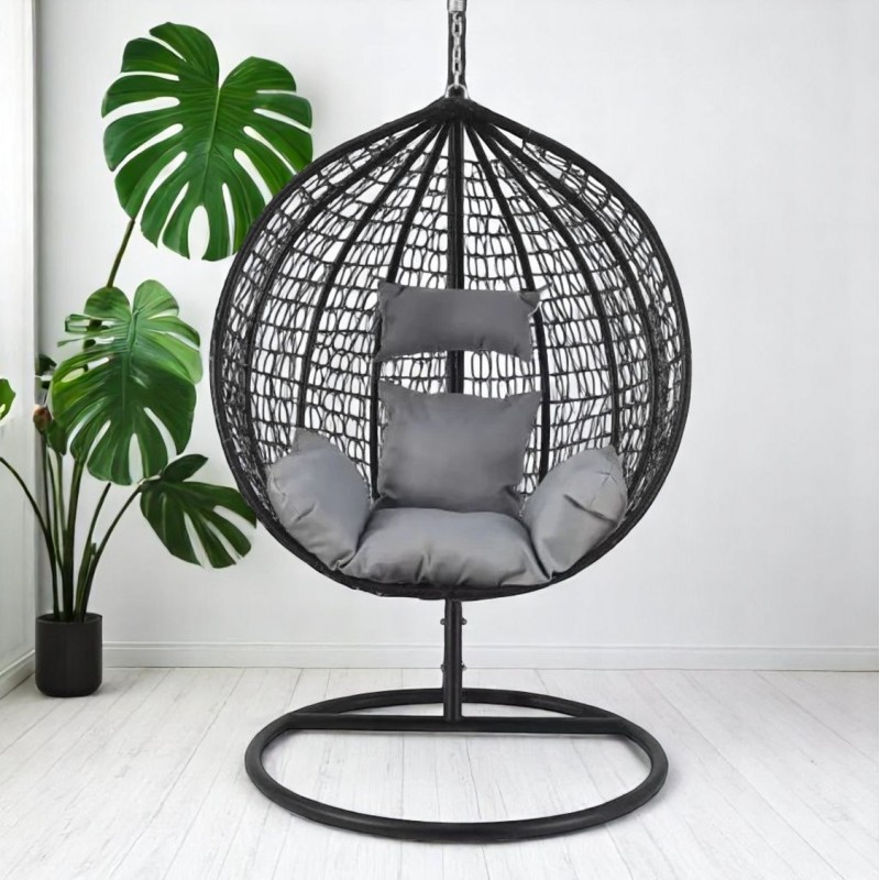 Fotel wiszący, huśtawka kokon czarny z grafitowymi poduszkami KR23