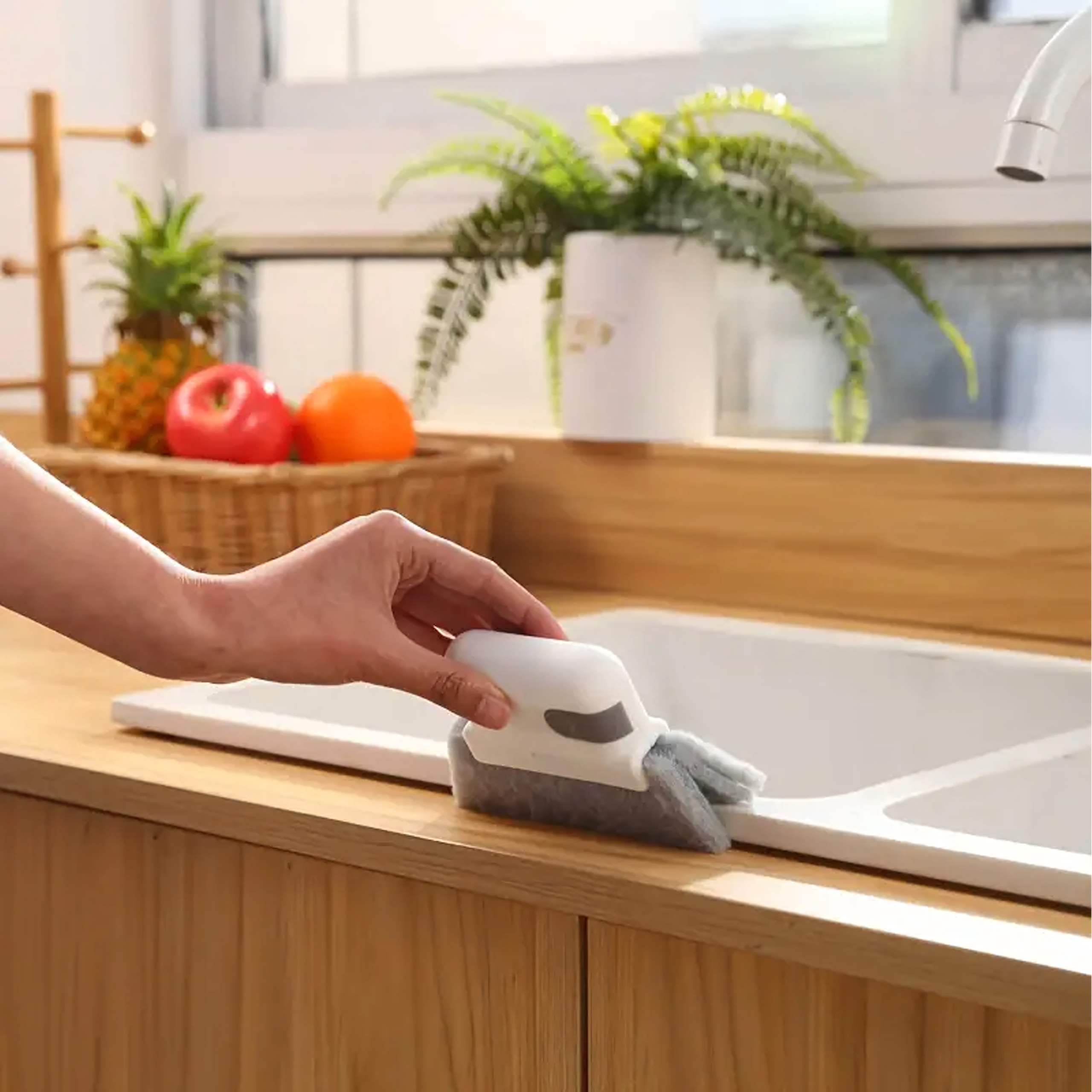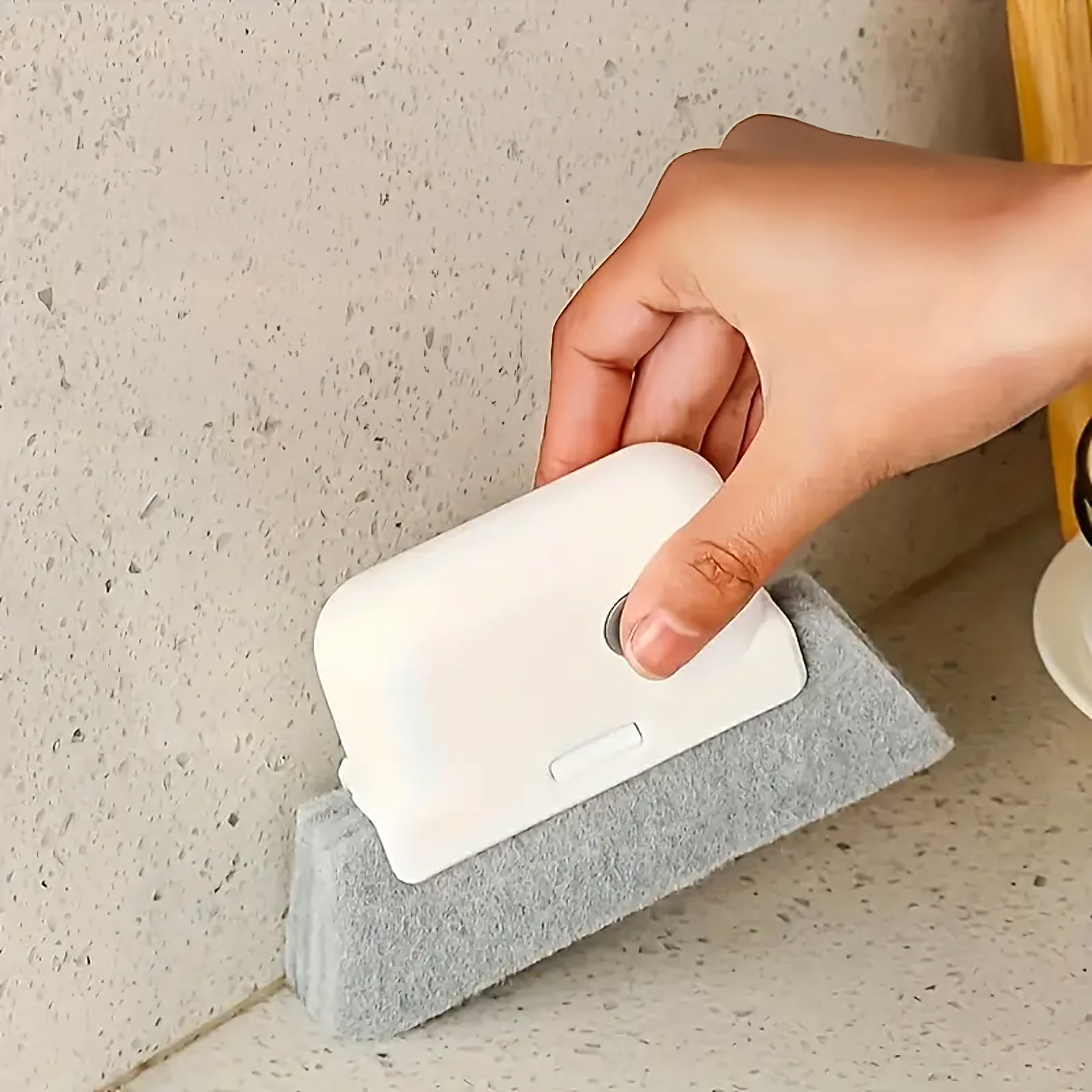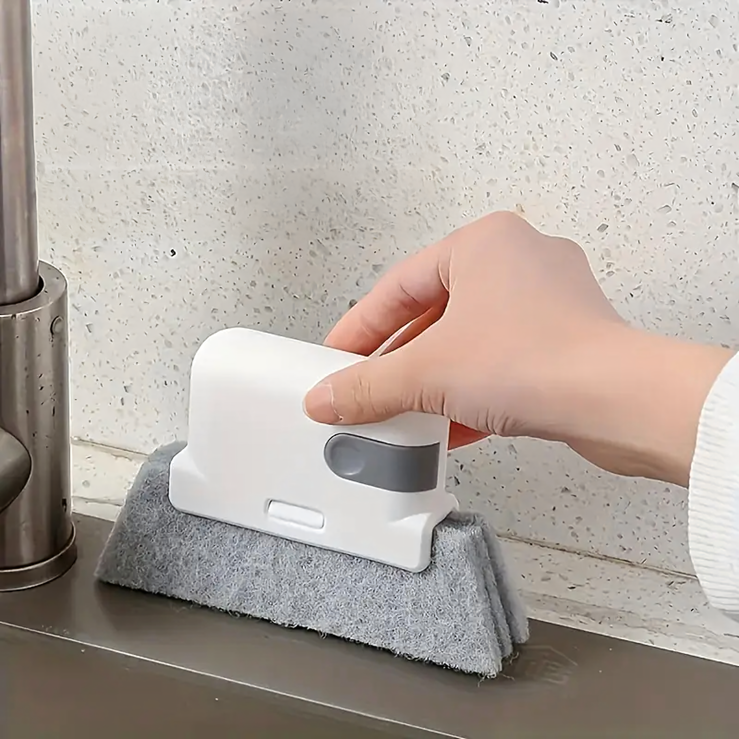 Uniwersalna gąbka–szczotka z trwałym włosiem do precyzyjnego czyszczenia ram okiennych, rowków w drzwiach, prowadnic, armatury i innych trudno dostępnych miejsc, wygodna w użyciu i łatwa w utrzymaniu czystości.
