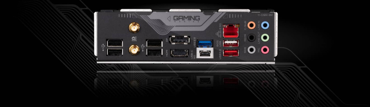 | Złącza I/O na tylnym panelu | 1x HDMI, 1x DisplayPort, 1x USB Type-C, 1x USB 3.2 Gen. 2, 1x USB 3.2 Gen. 1, 5x USB 2.0, 1x RJ-45, 2x Złącze anteny Wi-Fi, 6x Audio jack |