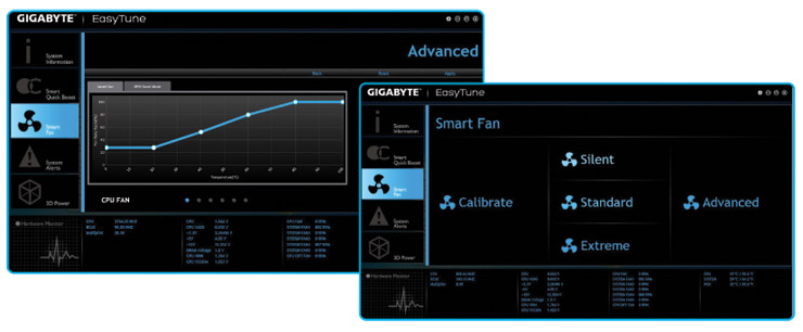 GIGABYTE na swoich płytach oferuje do 9 złącz wentylatorów. Posiada również udoskonalony system zarządzania prędkością obrotową wentylatorów, którą można dopasować do indywidualnych potrzeb użytkownika. Służy do tego aplikacja Smart Fan2.