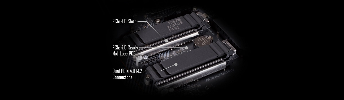 Płyta główna jest wyposażona w gniazda PCIe 4.0, zapewniające lepszą przepustowość w porównaniu do poprzedniej generacji. Wydajność kart graficznych i dysków SSD PCIe NVMe nie będzie ograniczona przez niewystarczającą przepustowość. Gniazda PCIe zostały dodatkowo wzmocnione, aby wytrzymać ciężar największych kart graficznych.