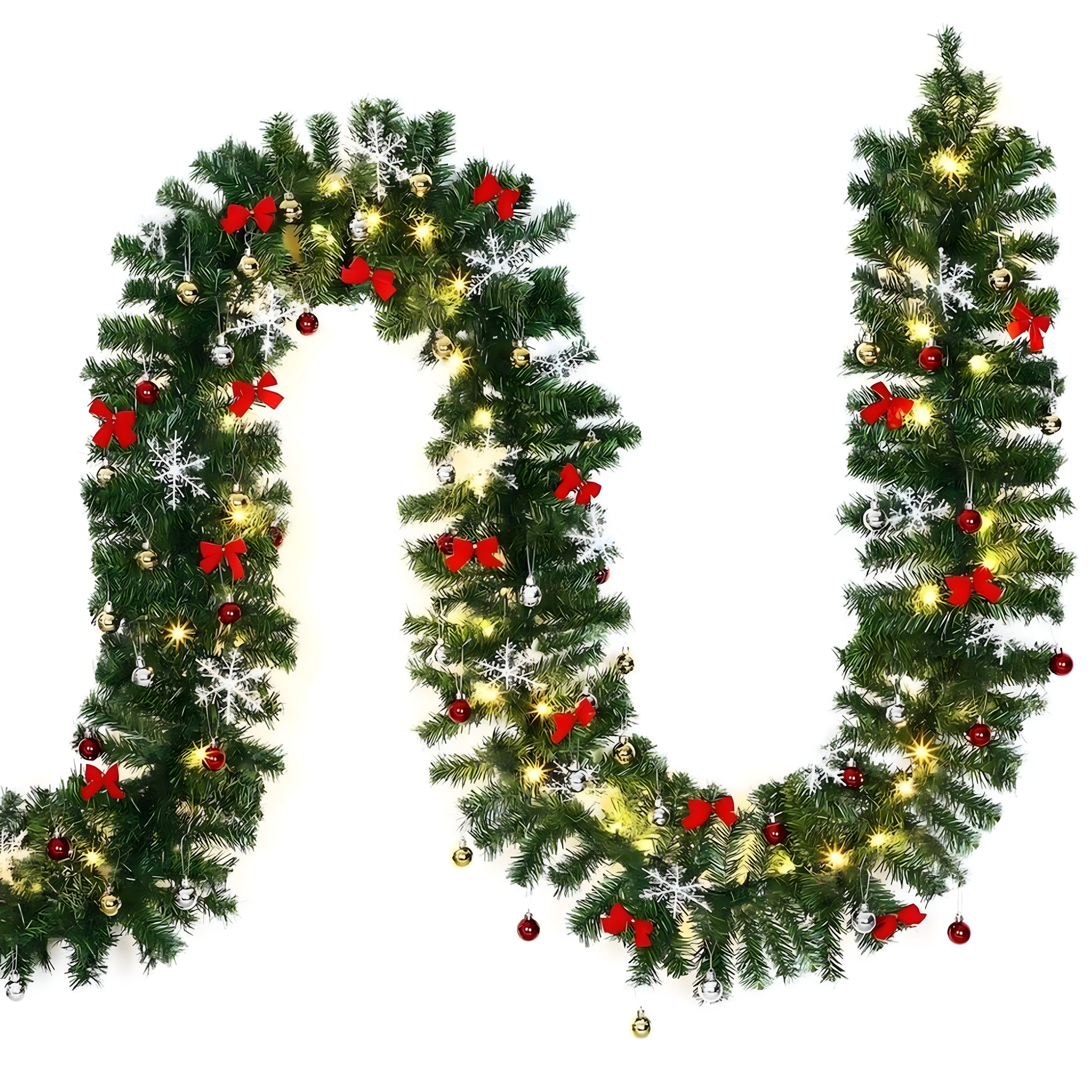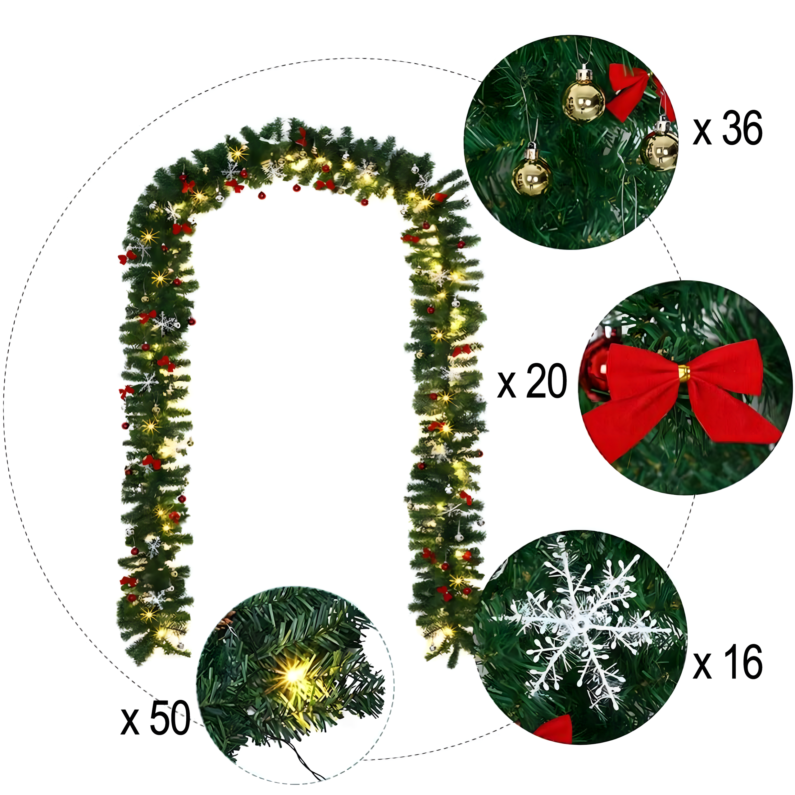 Stwórz w swoim domu magiczny klimat świąt dzięki girlandzie LED o długości 2,7 m. Dekoracja posiada aż 260 gałązek, bombki, kokardki, śnieżynki oraz 50 światełek LED, które rozświetlą wnętrze ciepłym, nastrojowym światłem. Idealna na kominek, drzwi, schody czy balustrady.