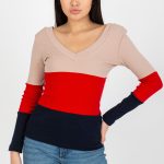 Sweter z długim rękawem oraz golfem, wykonany z tkaniny prążkowanej w trzech kolorach.