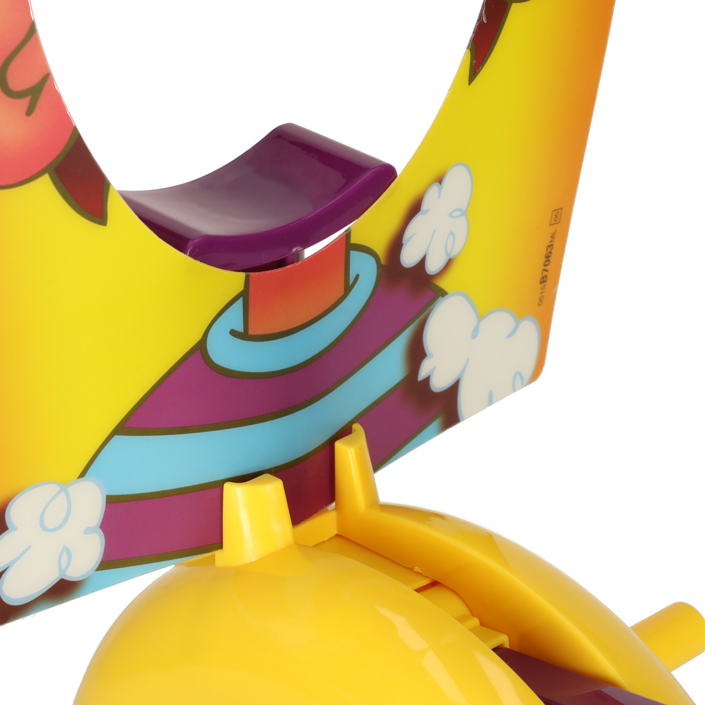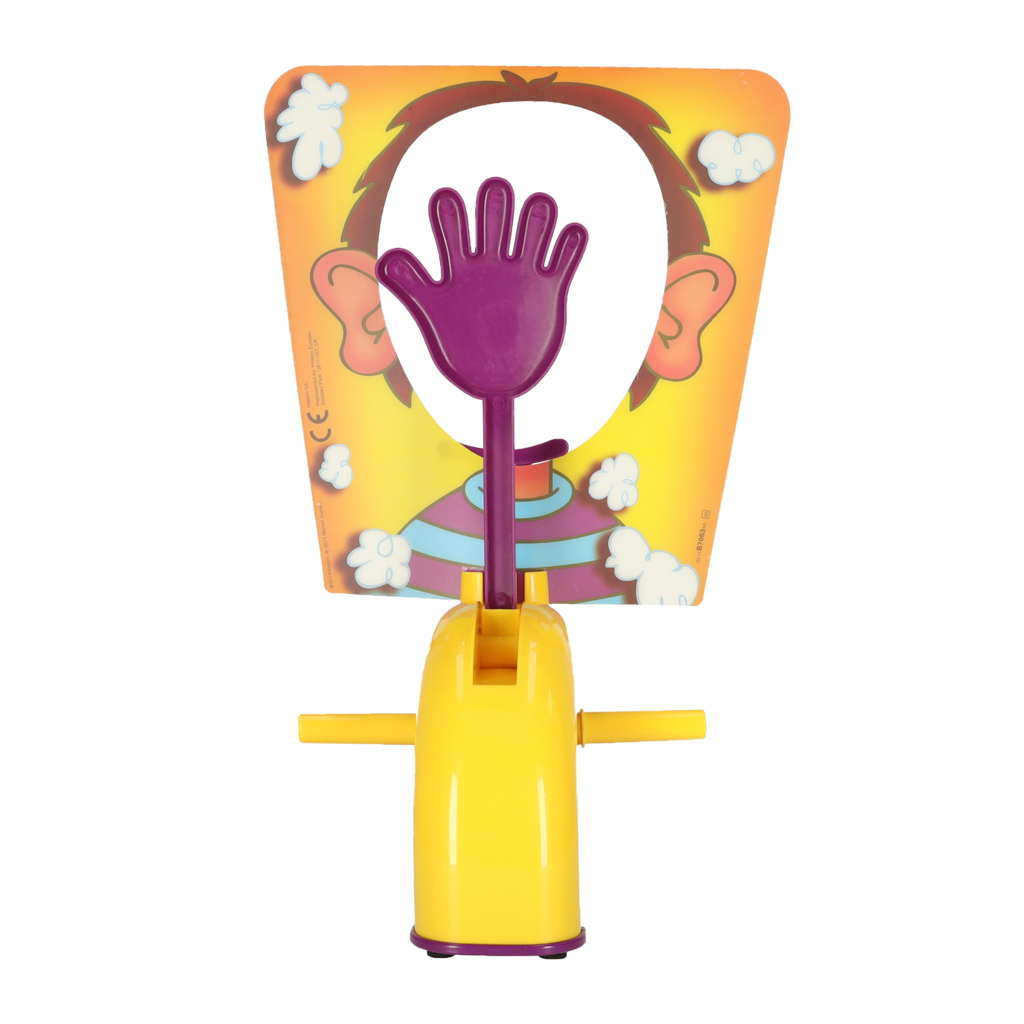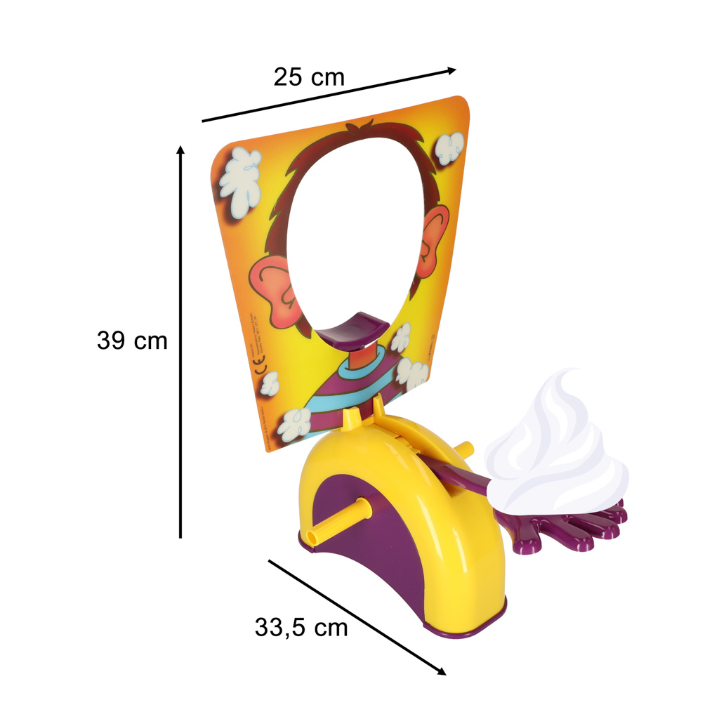 Gracz kręci wskazówką, umieszcza głowę w otworze i przekręca lewarek zabawki tyle razy ile wskazała strzałka. Każde ruch lewarka może zwolnić mechanizm sprężynowy posyłając łapkę pełną bitej śmietany, proso w twarz gracza. Wymiary: 33,5x25x39cm