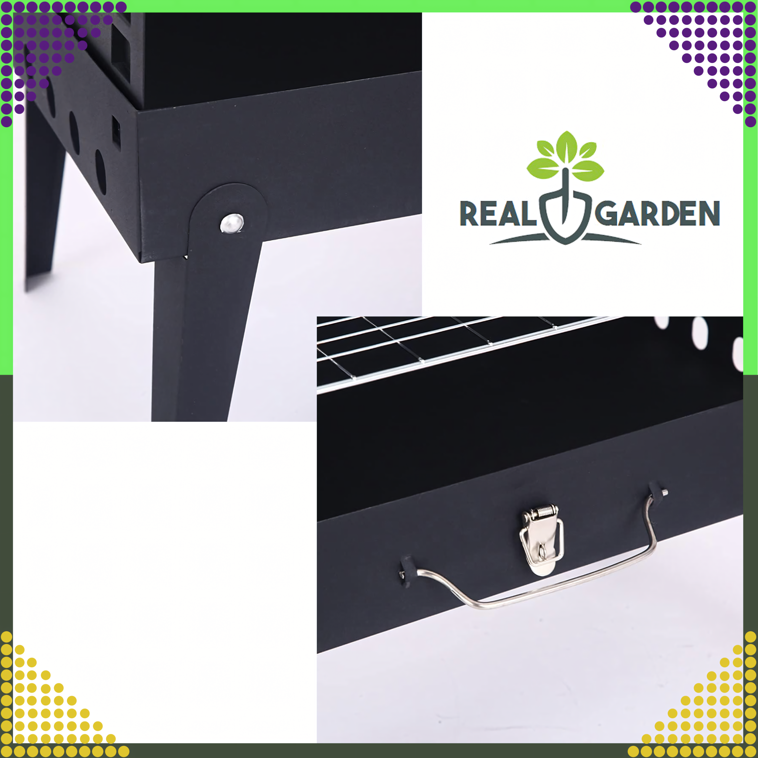 Składany grill ogrodowy wykonany ze stali nierdzewnej malowany na czarny kolor. Wyposażony w dolny ruszt na węgiel oraz uchwyty po bokach ułatwiające przenoszenie.