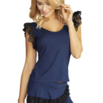 Satynowa haleczka o długości przed kolano niewątpliwie przykuwa uwagę dekoltem wykończonym misterną koronką, która tworzy kształt kuszącej łezki. Regulowana długość naramek pozwala Tobie decydować o tym jak głęboko ma sięgać koronkowe wycięcie. Wszystko zależy od tego jak dużo chcesz zakryć lub pokazać…Dół koszulki został wykończony tą samą koronką, co daje efekt harmonijnej całości.