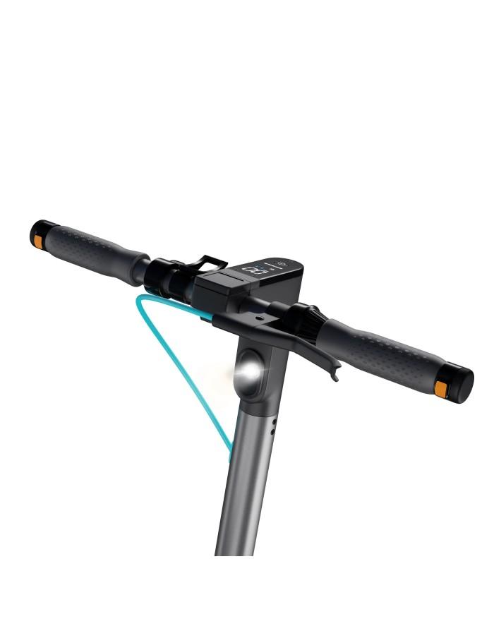 Panel LCD prezentuje kluczowe dane (prędkość, stan baterii), a aplikacja My Scooty (Android/iOS) umożliwia zdalne zarządzanie ustawieniami przez Bluetooth. Certyfikat IPX4 chroni przed zachlapaniami i kurzem, a przycisk POWER pozwala szybko zmieniać tryby jazdy (ECO/Drive/Sport) i sterować oświetleniem. Przednia lampa (2,5 W) i odblaski zwiększają widoczność po zmroku.