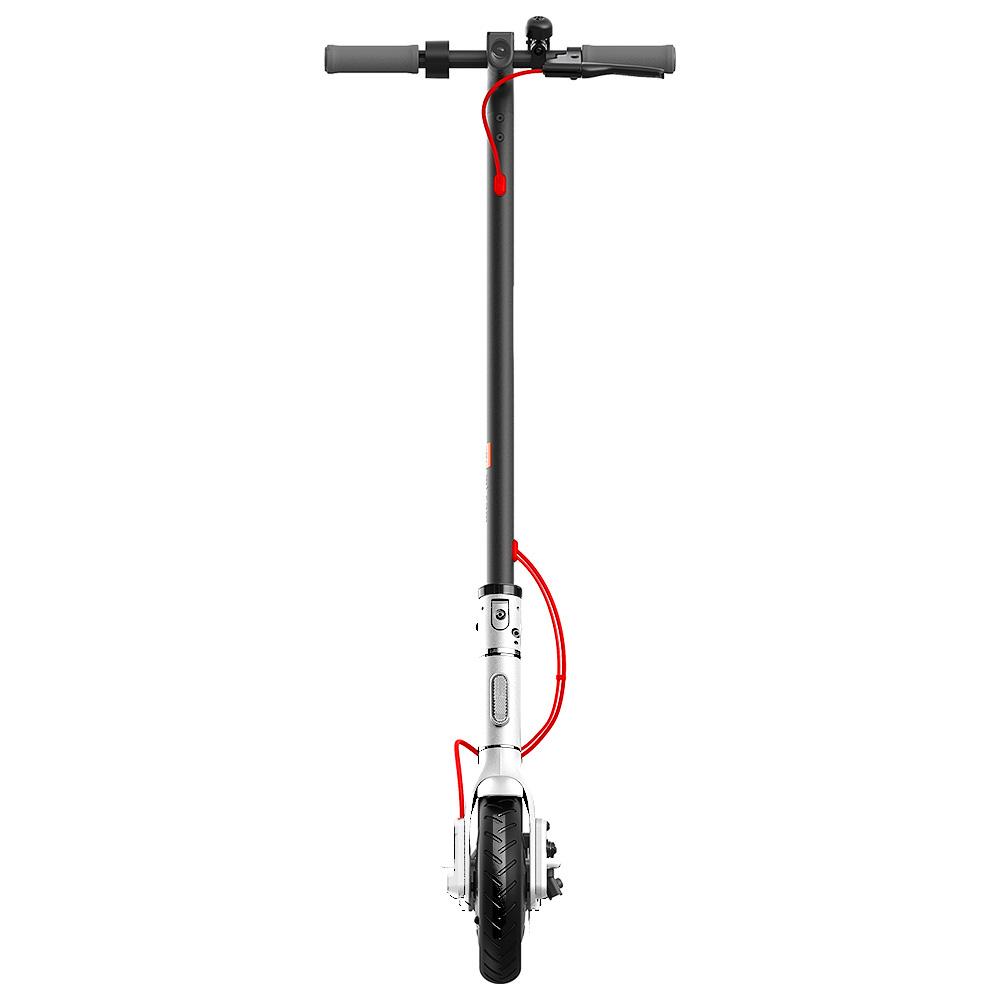 Wszystkie elementy sterujące zostały umieszczone na kierownicy. Aby włączyć lub wyłączyć silnik, wystarczy wcisnąć przycisk zasilania. Nad nim znajduje się wskaźnik poziomu naładowania hulajnogi ze zintegrowanymi diodami LED. Już na pierwszy rzut oka widać, ile baterii pozostało. Aby kontrolować prędkość jazdy, skręć przepustnicę i wybierz najbardziej odpowiednią prędkość jazdy. Nawet, gdy gwałtownie ją przekręcisz, skuter będzie płynnie się rozpędzał.