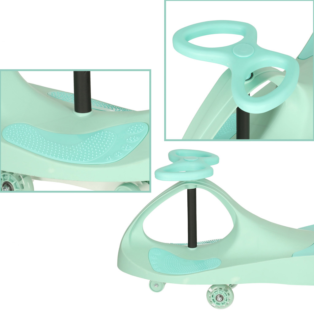 Miętowy jeździk grawitacyjny ze świecącymi kołami to gwarancja super zabawy. Aby wprawić pojazd w ruch, wystarczy naprzemiennie poruszać kierownicą – nie trzeba odpychać się nogami. Max. obciążenie: 80 kg. Tworzywo: plastik. Wym: 79,5 cm x 29,5 cm x 40 cm