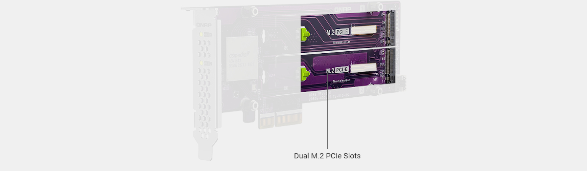 Dodanie dysków SSD M.2 umożliwia urządzeniu QM2-2P-244A zwiększenie ogólnej wydajności operacji IOPS komputera z systemem Windows/Linux. PCIe zapewnia wyższą prędkość przesyłu danych, co przyczynia się do większych prędkości obliczania i dostępu do danych.