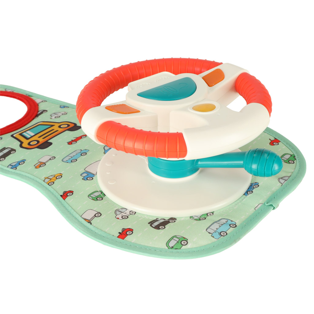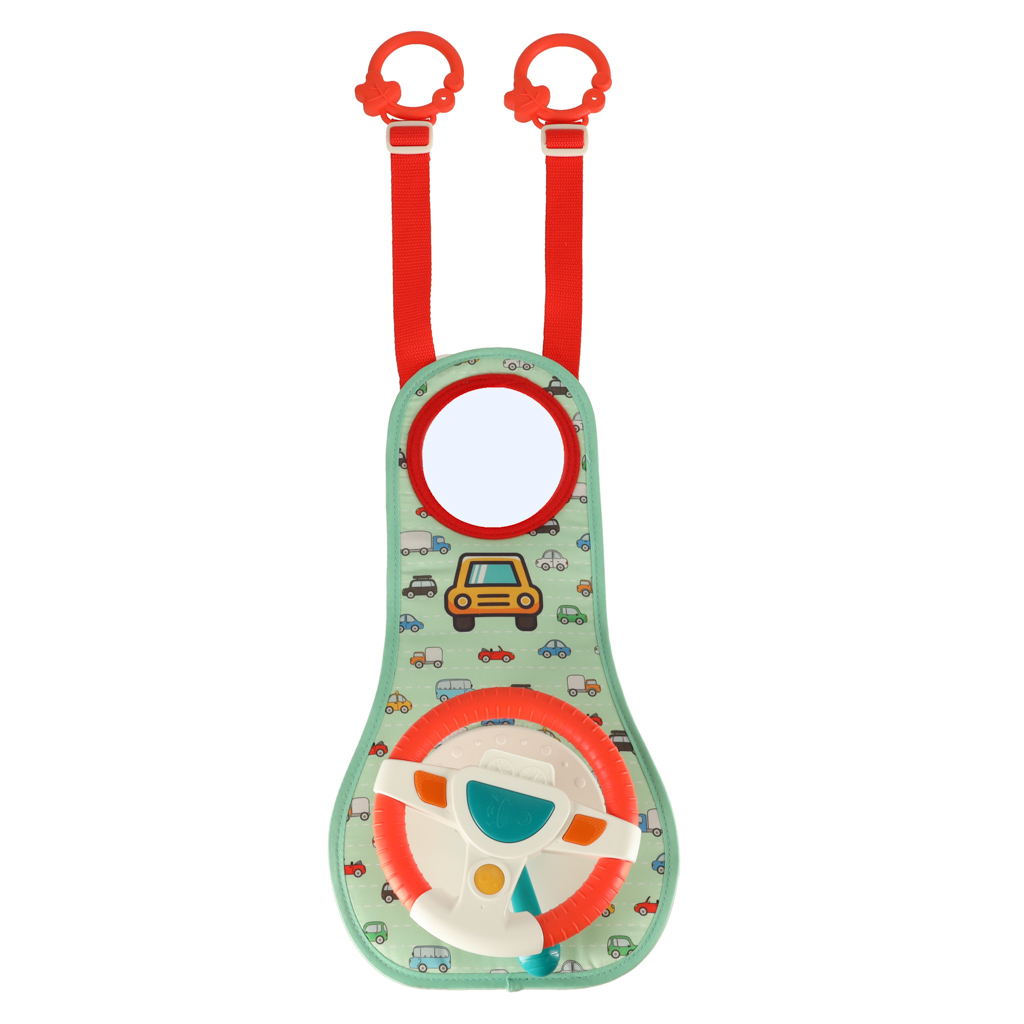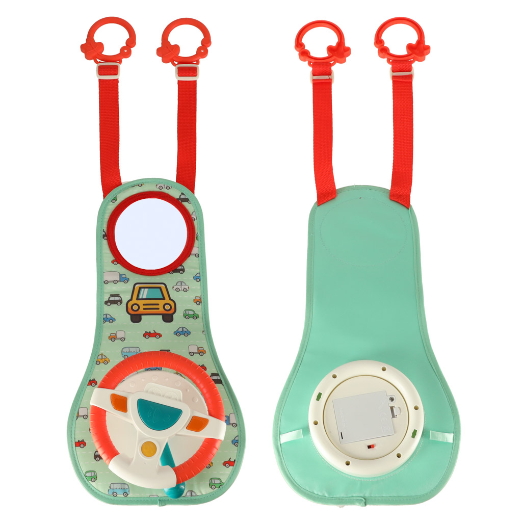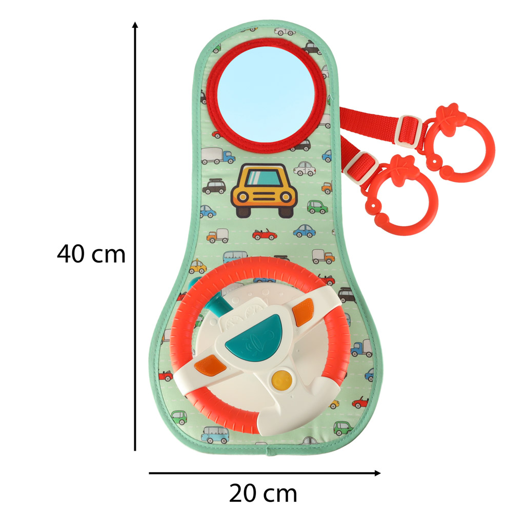 Interaktywna kierownica z możliwością montażu w samochodzie. Idealnie sprawdzi się podczas podróży z maluchem. Zasilanie: 3x bateria AA 1,5V (w zestawie). Wym. kierownicy: 40x20cm. Śr. bezpiecznego lusterka: 10cm.