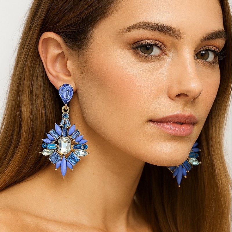 Kolczyki ROZETKI efektowne, wiszące kryształy fiolet, niebieski K566