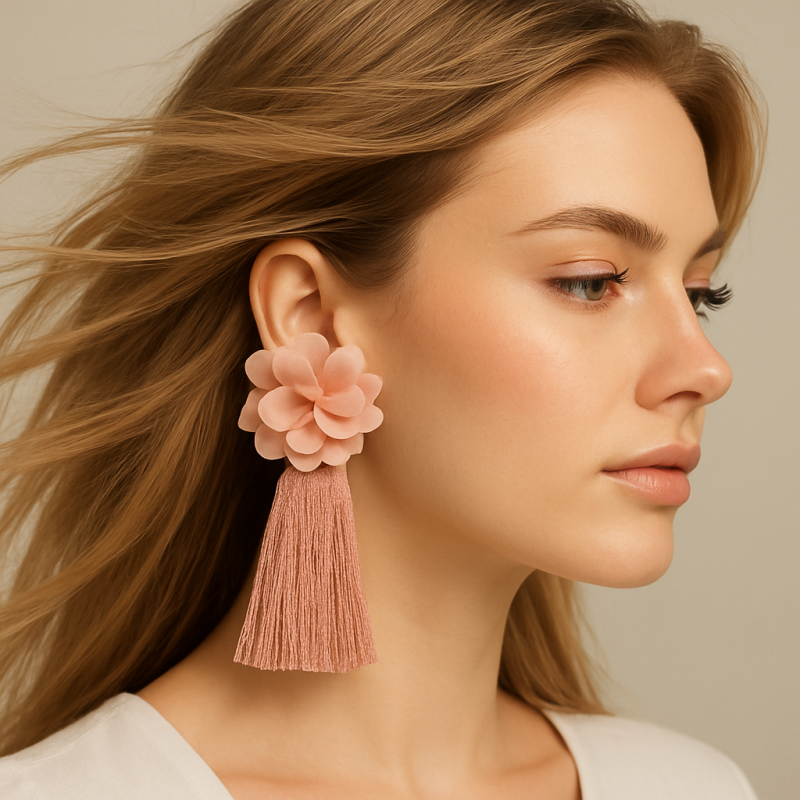 Kolczyki sztyft, tiulowy KWIAT, frędzle róż K884