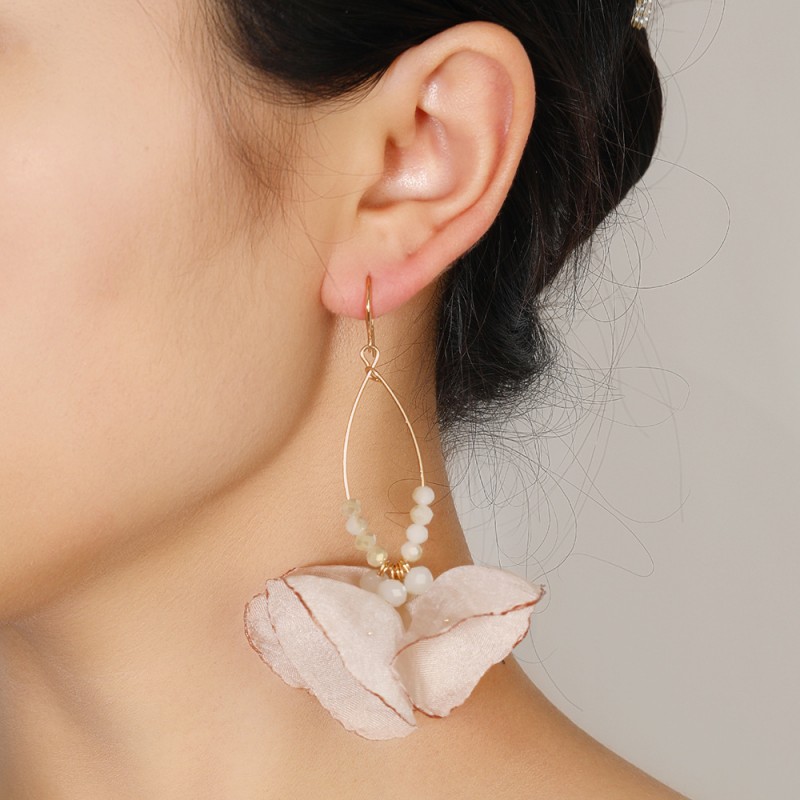 Kolczyki wiszące, efektowne tiulowe z koralikami pudrowe K1700