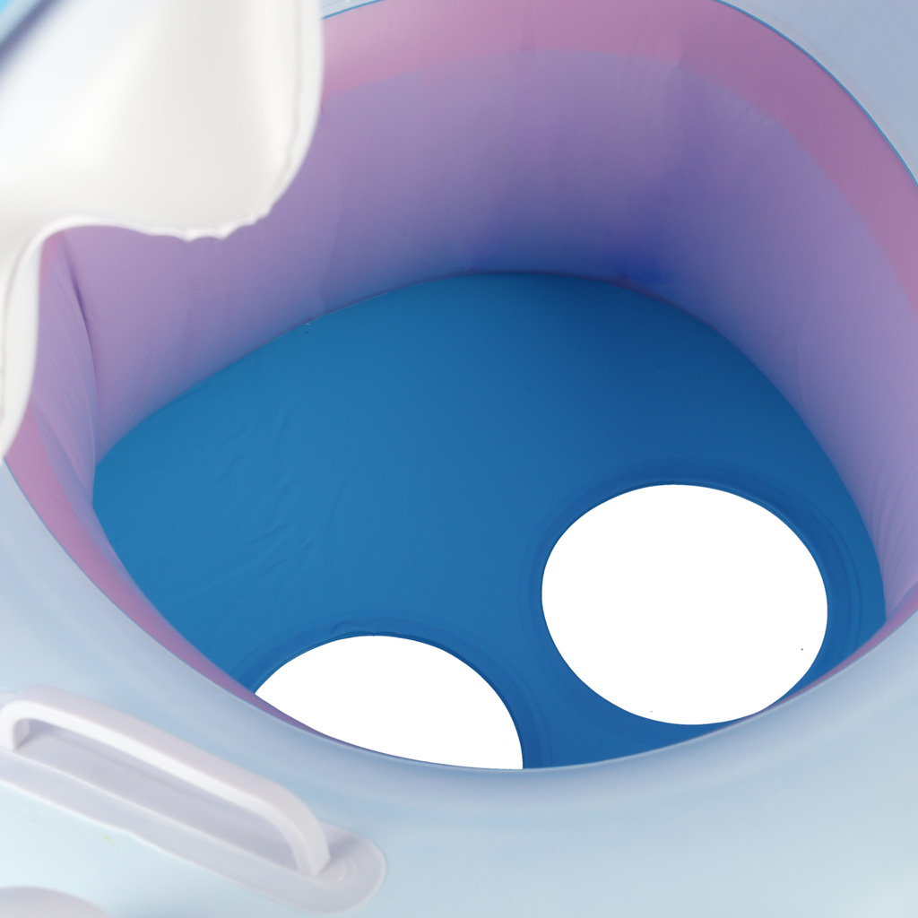 Super pontonik dmuchany z daszkiem – rekin. Przyciągnie uwagę dziecka i zachęci do kąpieli. Posiada zdejmowany daszek chroniący przed promieniami słonecznymi. Max waga dziecka: 23kg. Średnica wewnętrzna: 25cm. Wym. pontonika: 96x78x70cm.