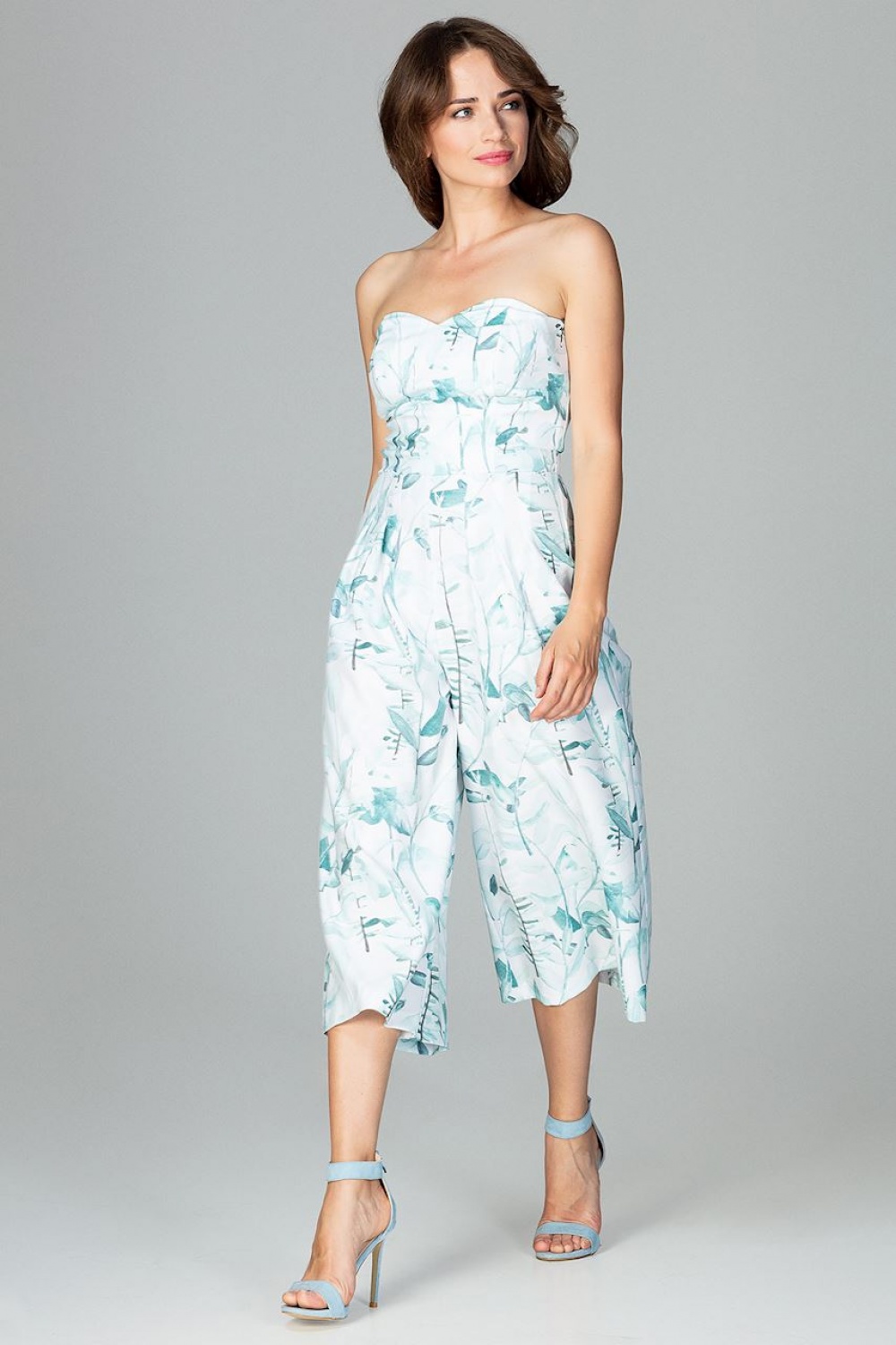 Nowoczesny sposób na klasyczny kombinezon. Stanowi wygodną i modną alternatywę dla sukienek. Oryginalny z orientalnym wzorem. Wykonany z miękkiej, elastycznej tkaniny. Kombinezon bez ramiączek z gorsetem w stylu culotte. Tworzy dojrzały wygląd, podkreśla dekolt nadając mu seksowności zachowując klasę.