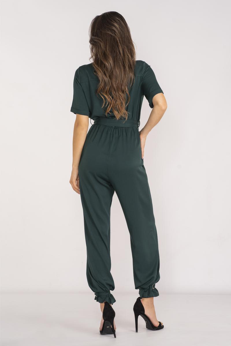 Wygodny i stylowy kombinezon z klasycznym kołnierzem i kopertowym dekoltem. Gumka w pasie i pasek pozwalają na podkreślenie talii. Model posiada krótkie rękawy, dzięki czemu idealnie nadaje się na letnie wyjścia. Kombinezon posiada dwie boczne kieszenie oraz długie nogawki zakończone paskami, dzięki którym można dopasować szerokość. Produkt wyprodukowany w Polsce.