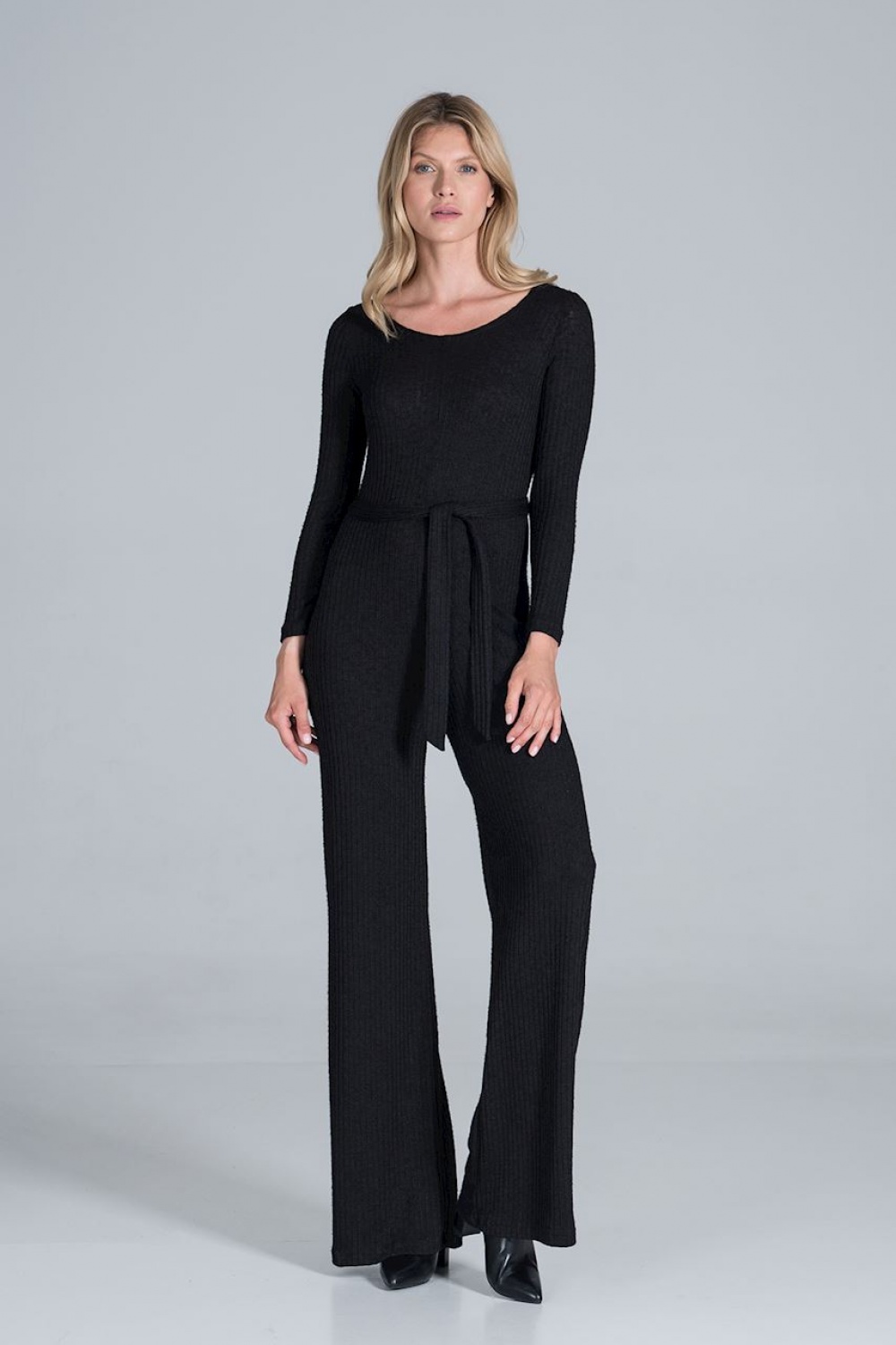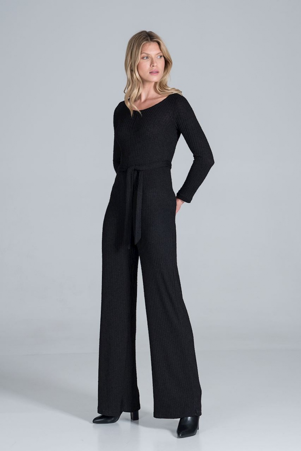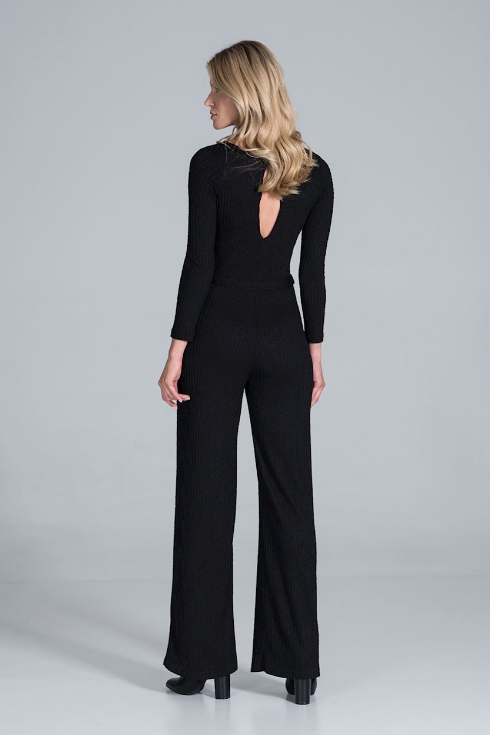 Kombinezon z długim rękawem i szerokimi nogawkami z lejącej, prążkowanej dzianiny, z rozcięciem z tyłu zapinany na zatrzask.