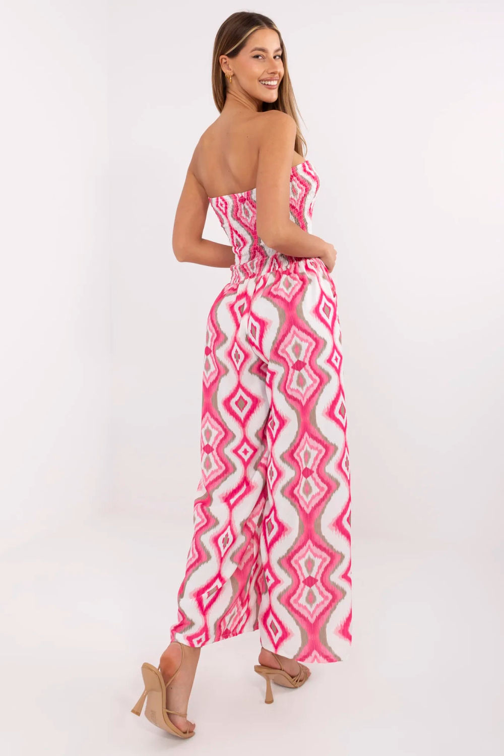 Stylowy i wygodny kombinezon z geometrycznym wzorem to idealna propozycja na co dzień. Wykonany z lekkiej, przewiewnej wiskozy, doskonale sprawdza się w cieplejsze dni, zapewniając komfort i swobodę ruchów. Nowoczesny design łączy w sobie kobiecy styl z miejskim luzem. Model bez rękawów, z prostokątnym dekoltem oraz delikatnymi marszczeniami w górnej części, które dodają objętości i subtelnego uroku. Wszyte usztywniane miseczki zapewniają dobre podtrzymanie biustu i pozwalają nosić kombinezon bez stanika. Brak zapięcia ułatwia zakładanie, wystarczy wsunąć go przez głowę. Długie, szerokie nogawki pięknie się układają i optycznie wydłużają sylwetkę, a praktyczne, wsuwane kieszenie dodają funkcjonalności. To doskonały wybór na codzienne wyjścia, spacery czy spotkania, kiedy chcesz wyglądać modnie, a jednocześnie czuć się swobodnie.