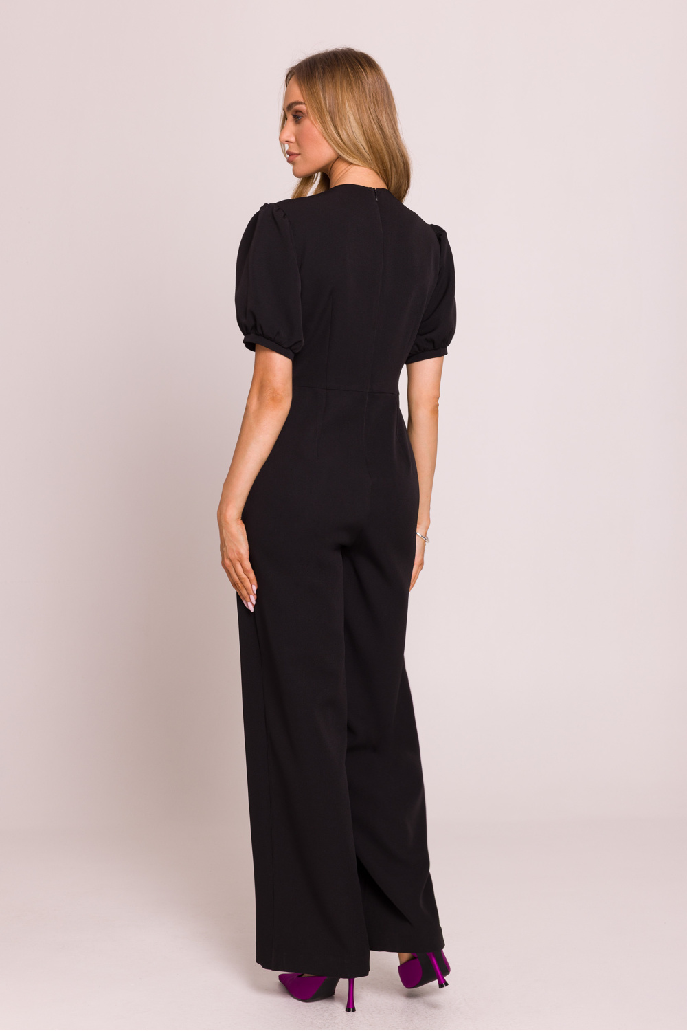 Stylowy kombinezon o kobiecym kroju, wykonany z wysokiej jakości tkaniny. Głęboki dekolt w kształcie litery V pięknie eksponuje szyję i dekolt, a podkreślona talia podkreśla sylwetkę. Krótkie bufiaste rękawy zakończone mankietami dodają romantycznego akcentu, a lekko poszerzone nogawki z zakładkami od talii zapewniają elegancki i swobodny look. Model zapinany na kryty zamek z tyłu, z górą na podszewce dla większego komfortu noszenia. Całość zaprojektowana i uszyta w Polsce z dbałością o każdy detal.