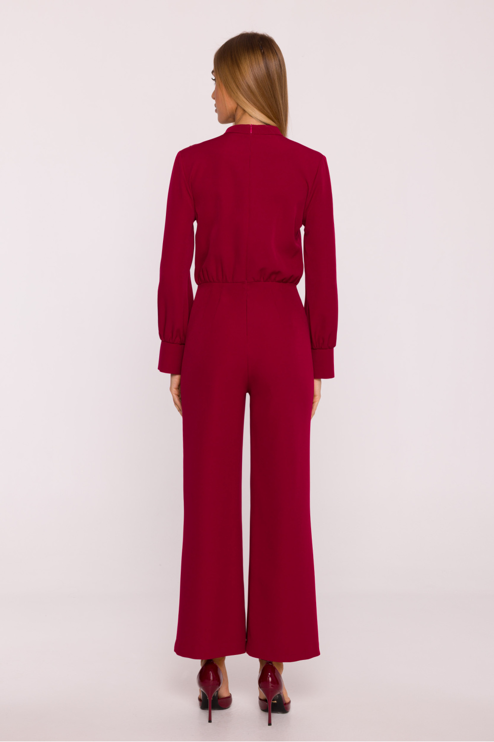 Stylowy kombinezon uszyty z gładkiej tkaniny o matowym wykończeniu to propozycja, która łączy nowoczesny charakter z ponadczasową elegancją. Jednoczęściowa forma pięknie podkreśla sylwetkę, a dopasowana talia i szerokie nogawki 7/8 nadają całości lekkości i swobody. Góra kombinezonu wyróżnia się stójką z delikatnym marszczeniem przy ramieniu, które subtelnie modeluje linię ramion i nadaje wyjątkowego szyku. Długie rękawy zakończono szerokimi mankietami z rozcięciem, podkreślając elegancki charakter projektu. Ozdobne guziki na ramieniu stanowią stylowy detal, dodający całości niepowtarzalności. Model zapinany jest na kryty zamek z tyłu, co zapewnia wygodę zakładania i estetyczne wykończenie. Brak podszewki i kieszeni sprawia, że kombinezon pozostaje lekki, a gładka tkanina pozwala na tworzenie wielu różnorodnych stylizacji, od codziennych po wieczorowe. Zaprojektowany i uszyty w Polsce, stworzony z myślą o kobietach ceniących elegancję, komfort i ponadczasowy design.
