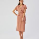 Elegancki, klasyczny kombinezon wykonany z gładkiej tkaniny o miękkim wykończeniu. Góra dopasowana, ozdobiona subtelnym żabotem, wykończona stójką pod szyję. Długie, lekko bufiaste rękawy zakończone są mankietami zapinanymi na ozdobne guziki, co dodaje całości wyrafinowanego charakteru. Talia została wyraźnie zaakcentowana, co podkreśla sylwetkę i harmonijnie przechodzi w luźniejsze, proste nogawki zaprasowane na kant. Na plecach kryty zamek zapewnia komfort noszenia i estetyczne wykończenie. Model łączy w sobie ponadczasową klasykę z nowoczesnym detalem, idealny zarówno na eleganckie wyjścia, jak i formalne okazje. Zaprojektowano i uszyto w Polsce.