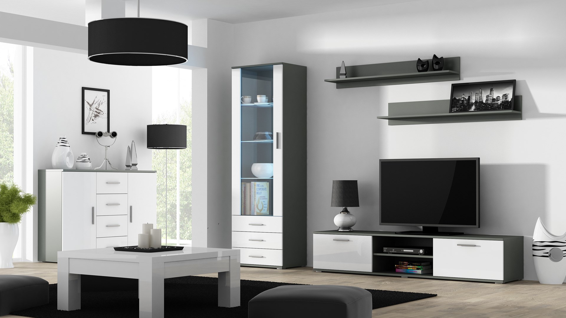 Istnieje możliwość dokupienia oświetlenia szafkowego LED., Płyta wiórowa laminowana wyróżnia się odpornością na naprężenia mechaniczne i ekstremalne temperatury, Wewnątrz szafek po jednej półce, Meble do samodzielnego montażu, Zdjęcia zestawów przedstawiają przykładową aranżację z innymi meblami z kolekcji. Pozostałe bryły są dostępne w osobnej sprzedaży.