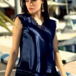 Koronkowa koszulka z odkrytymi plecami. Intensywnie czarna, sexy. Idealna na sezon wiosna-lato, miseczki w stylu bralette, przedłużane, wiązane na szyi. Krój dopasowany do ciała, koronka miękka i elastyczna. W obwodzie miękka gumka aby krój ładnie trzymał się ciała. Stringi w komplecie.