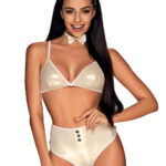 Uroczy króliczek w nieco innym wydaniu! Neo Goldes to 4-częściowy zestaw bielizny, w którym będziesz wyglądać zarówno słodko jak i seksownie. Wykonany z lekko błyszczącej, jasnej i jednocześnie elastycznej tkaniny – świetnie prezentuje się na sylwetce. W zestawie ładnie podkreślające talię, wysokie figi z ogonkiem (ogonek jest odpinany), biustonosz w konstrukcji soft (bez fiszbin), kokardka na szyję oraz opaska z doczepianymi uszami w złotym kolorze.