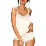 Dziś jest Twój wieczór! Wskocz w ten zmysłowy, lekko prześwitujący peniuar i ciesz się sexy wyglądem. Peniuar możesz założyć również bezpośrednio na nagie ciało, potęgując kuszący efekt (bądź po prostu na bieliznę). Rozkocha Cię w sobie jego delikatna miękkość, koronkowe zdobienia, koronkowy pasek wiązany na satynową kokardę oraz uroczy choker na szyję, także dołączony do zestawu. Nie wahaj się, ten zmysłowy peniuar po prostu musi być Twój. Stringi nie należą do zestawu.
