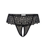 Damskie wyjątkowo atrakcyjne stringi w czarnym kolorze zostały stworzone z delikatnej, transparentnej siateczki wysokiej jakości, przyjemnej w dotyku i przyjaznej dla kobiecej skóry. Przy linii bikini, z przodu, znajduje się mały trójkątny panel z przezroczystej siateczki, którego górna część ozdobiona jest wyrazistą koronką w romantycznym motywie kwiatowym. W tyle stringów umieszczony jest również niewielki trójkącik, który łączy się z delikatnym paseczkiem przylegającym między pośladkami. Stringi są bardzo odważne, eksponując całe pośladki w niezwykle uwodzicielski sposób. Wokół bioder wykończone są delikatnym paskiem połączonym z przodu za pomocą drobnych złotych ozdobnych kółeczek. Te elastyczne paski są miłe w dotyku i nie uwierają w biodra. W obszarze kroku wewnętrzna strona jest podszyta delikatną, wilgotność wchłaniającą bawełną, co zapewnia świeżość i komfort podczas noszenia. Poza efektowną koronką z przodu i ozdobnymi złotymi pierścieniami, stringi nie posiadają innych ozdób ani kokardek. W połączeniu z krótką, seksowną koszulką tworzą idealny zestaw na romantyczną randkę we dwoje, z pewnością przyciągając uwagę partnera. Stringi można prać w odpowiedniej temperaturze, nie tracąc swojego kształtu.