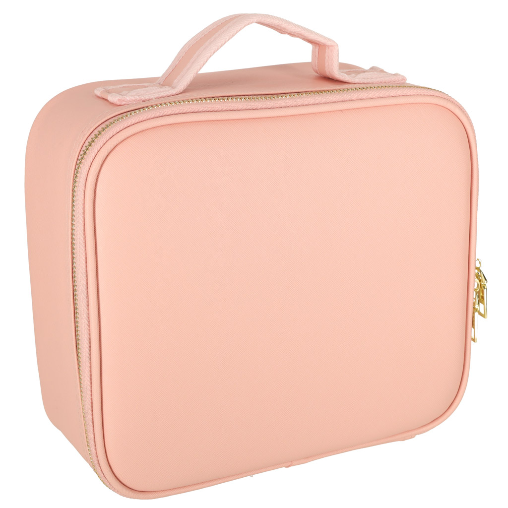 Duża kosmetyczka podróżna z wbudowanym lusterkiem z oświetleniem LED. Dzięki niej wykonanie makijażu będzie możliwe w każdym miejscu. W zestawie saszetka na pędzle i lustertko powiększające. Ilość trybów świecenia: 3. Kolor: różowy. Wymiary: 27×24,2x10cm.