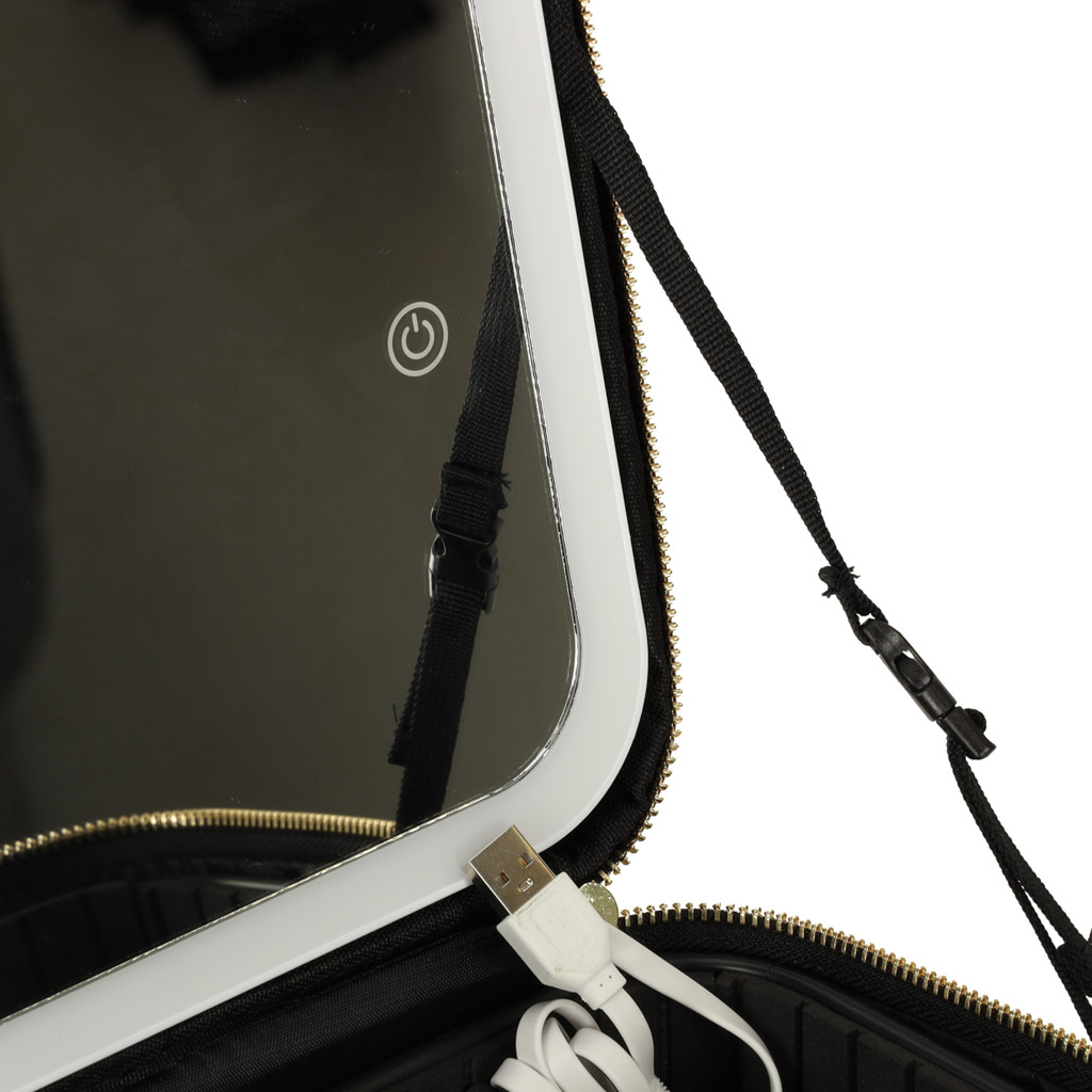 Duża kosmetyczka podróżna z wbudowanym lusterkiem z oświetleniem LED. Dzięki niej wykonanie makijażu będzie możliwe w każdym miejscu. W zestawie saszetka na pędzle. Ilość trybów świecenia: 3. Kolor: czarny. Wymiary: 27×24,2x10cm.